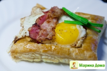 Яичница на завтрак – любимое блюдо. Но обычную яичницу можно сварганить в будний день. А вот в выходные дни нужно постараться придумать нечто эдакое, оригинальное. Но, желательно, не слишком сложное. Появилась идея – приготовить бутерброд с яичницей, но не на хлебе, а на слоеном тесте. Ну, и добавить на такой бутерброд что-то еще. Конечно, обжаренный хрустящий бекон, обжаренные шампиньоны, соус для пикантности. Для первого раза достаточно.