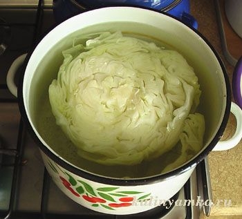 Укладываем его в кастрюлю срезом вверх и заливаем кипятком так, что бы вода покрыла капусту. Можно довести ее до кипения и выключить. Пусть постоит пару часов. Вода проникнет между листьями и размягчит их. Далее, воду надо слить, поставить капусту на тарелку или дуршлаг разрезом вниз, что бы хорошо стекла вода. Пока наша капуста париться в кипятке, мы приготовим для нее начинку.
