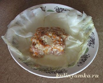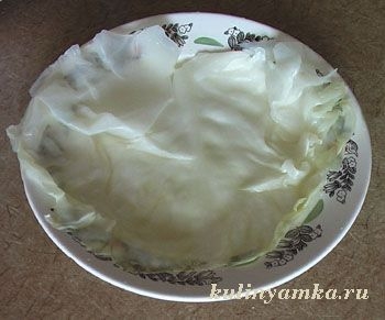 Остывший вилок, аккуратно, что бы не поломать листья, следует разобрать и на внутреннюю, вогнутую часть каждого листа положить фарш.