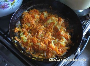 Лук с мясом лучше не перемалывать. Я нарезаю его полукольцами на обычной разделочной доске или кухонном комбайне, натираю морковь и обжариваю их на растительном масле. Жарю сразу и для фарша, и для соуса. Половину лука с морковью выкладываю со сковороды в тарелку, пусть остынет, это — для начинки.