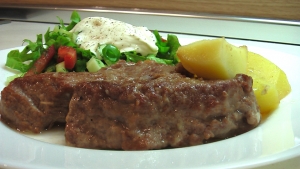 Рецепт из «Книга о вкусной и здоровой пище» Говядина тушеная с луком и картофелем Мясо- мякоть (огузок, кострец) обмыть, нарезать кусками весом 80-150 г, посолить, посыпать перцем, обвалять в муке и обжарить на сковороде со всех сторон до образования румяной корочки. Затем мясо сложить в кастрюлю; на сковороду, где жарилось мясо, влить 1 стакан воды, вскипятить, процедить сквозь сито в кастрюлю с мясом, добавить еще 2 стакана горячей воды, накрыть кастрюлю крышкой и поставить тушить на слабый огонь на 2-2,5 часа; после тушения к мясу добавить отдельно поджаренный, мелко нарезанный лук и обжаренный целый или разрезанный на 2-4 части картофель, 1 лавровый листик, 2 шт. гвоздики и 5-6 горошин перца (или десятую часть стручкового), после чего продолжать тушить мясо в течение получаса. При подаче на стол мясо посыпать мелко нарезанной зеленью петрушки или укропом. Отдельно можно подать огурцы, салат зеленый или из помидоров. На 500 г мяса — 800 г картофеля, 2-3 головки лука, 1 ст. ложку муки, 2 ст. ложки масла.