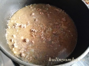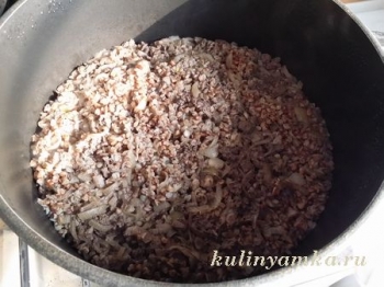 В другую кастрюлю налить воду, посолить, довести до кипения и выложить печень с луком. Туда же отправить и гречку. Перемешать, дать закипеть воде и убавить нагрев.