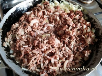 На сковороду налить растительное масло и положить кусочек сливочного. Когда масло растает и заскворчит на сковороде, выложить лук. Обжарить его минут 5. Выложить к луку печень и пожарить еще минуты 3 при непрерывном помешивании. Печень должна загустеть, но не приготовиться полностью.