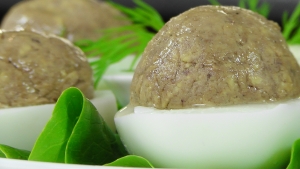 Яйца фаршированные куриной печенкой Рецепт приготовления вкусной холодной закуски. Лук и печенку мелко нарезать и обжарить в горячем масле. Накрыть крышкой и припустить 5 минут. Отваренные вкрутую яйца разрезать вдоль и удалить желтки. Желтки протереть через сито. Готовую печенку с луком также протереть и перемещать с желтком. Посолить и поперчить, по желанию добавить карри. Начинить половинки белков. Подовать с соусом. Яйца 3 шт.Куриная печенка 150 г.Лук порей 20 г.Растительное масло 40 мл.СольПерец Время приготовления 20 минут. 6 шт.