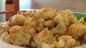 КАПУСТА ЦВЕТНАЯ ЖАРЕНАЯ С СУХАРЯМИ Сварить цветную капусту, разобрать на небольшие кочешки и обжарить на сковороде с маслом. Перед подачей на стол капусту обсыпать поджаренными сухарями, встряхнуть и положить на блюдо.