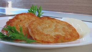 Рецепт из «Книга о вкусной и здоровой пище » Картофельные оладьи (на дрожжах) Очищенный сырой картофель быстро, во избежание потемнения, измельчить на терке, положить в кастрюлю или миску, добавить дрожжи, разведенные в 1/4 стакана теплой воды, посолить, всыпать муку (можно добавить одно яйцо). Все это хорошо размешать и поставить в теплое место для подъема. Выпекать оладьи надо на сильно разогретой с маслом сковороде. Подавать горячими со сметаной или маслом. На 500 г картофеля — 1/2 стакана муки, 25 г дрожжей, 2 ст. ложки масла.