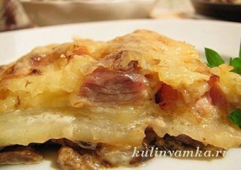 Противень следует смазать растительным маслом, выложить на него немного лука, на лук — слой мясо. Вместить его надо в один слой. Сверху мяса опять идет слой лука. Поверх лука размещаем картофель, подсоленный и сдобренный приправой для картофеля, если вы ее употребляете. Можно сделать 2 слоя картофеля, чередуя его с луком и промазывая майонезом. Когда все будет уложено, влить в противень бульон или молоко так, что бы верхний слой картофеля был чуть-чуть покрыт. Поставить противень в разогретую до 200 градусов духовку.