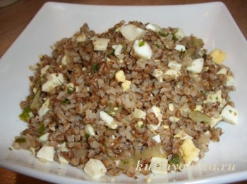 Пока гречка будет вариться, поджарьте на сливочном масле нарезанный репчатый лук. Яйца следует отварить заранее и нарезать на кусочки. К жареному луку выложите яйца и перемешайте. Сковороду с зажаркой накройте крышкой, и пусть постоит, пока готовится наша каша.
