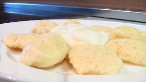 Приготовлено по рецепту из «Книга о вкусной и здоровой пище»: КЛЕЦКИ ИЗ ПШЕНИЧНОЙ МУКИ ИЛИ ИЗ МАННОЙ КРУПЫ В МАСЛЕ Вскипятив в кастрюле 31/2 стакана воды, посолить ее, положить ложку масла, затем засыпать манную крупу или муку и варить 6-8 минут, непрерывно помешивая. Заварившееся тесто снять с огня и, не давая остыть, по одному отбить в тесто сырые яйца, каждый раз размешивая его. Из полученного теста сделать клецки и опустить в кипящую, слегка подсоленную воду на 5-7 минут. Готовые клецки выбрать из воды шумовкой на сито, чтобы стекла вода, положить на тарелку, полить растопленным сливочным маслом и подавать на стол. Вместо масла клецки можно залить сметаной. В этом случае взять только 1 ложку масла для приготовления самого теста и 1/2 стакана сметаны. На 1 стакан манной крупы или пшеничной муки — 5 яиц, 1/2 чайнной ложки соли (в тесто) и 4 ст. ложки масла. В видео рецепте: Манная крупа 125 г. Яйца 2 шт. Соль 1/4 ч.л. Масло 1 ст.л. Вода 430 мл. Время приготовления 20 минут. 3 порции.