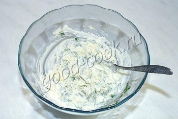 Смешать сыр, сметану, петрушку и чеснок.
