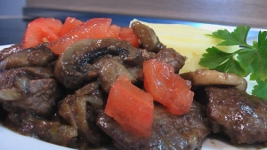 Куриная печень Форестер В сотейнике разогрейте растительное масло 3 ст.л. и сливочное 1 ст.л. Пассеруйте нарезанные грибы в течение одной минуты, а затем переложите в другую посуду. Снова поставьте сотейник на огонь и добавьте оставшееся растительное и сливочное масло. Добавьте нашинкованный лук и чеснок. Обжаривайте на среднем огне в течении 2-х минут. Переложите в другую посуду при помощи шумовки. Обмойте и оботрите куриную печенку. Обваляйте в смешанной с паприкой муке. Положите в сотейник и обжаривайте 5-7 минут помешивая. Переложите печенку в другую посуду. Поставьте в теплое место. Влейте в сотейник вино, добавьте нашинкованный фенхель. Прокипятите на слабом огне 4-5 минут. Снова положите в сотейник обжаренные грибы, лук и печенку, накройте крышкой и протушите 1 минуту. Посолите и поперчите. При подаче на стол посыпьте нарезанным кубиками помидор предварительно очищенный от кожицы и семян. Печенка 350 г. Мука 40 г. Паприка 1/2 ч.л. Растительное масло 8 ст.л. Сливочное масло 20 г. Шампиньоны 100 г. Лук 1/2 шт. Чеснок 1/2 зуб. Фенхель 1 ст.л. Белое сухое вино 60 мл. Помидор 1 шт. Время приготовления 25 минут. 2-ве порции.