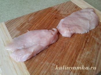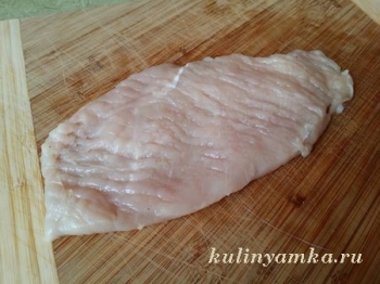 Каждое филе, если оно крупное, разрезать пополам по толщине. То есть, сделать разрез параллельно доске, чтобы из толстого филе получилось 2 тонких. Можно не разрезать его до конца, а оставить чуть не дорезанным. Тогда получится не 2, а одно большое филе.