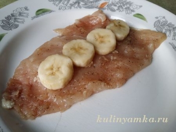 Разложить филе на тарелке или доске, уложить пластики банана.