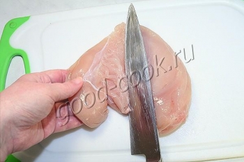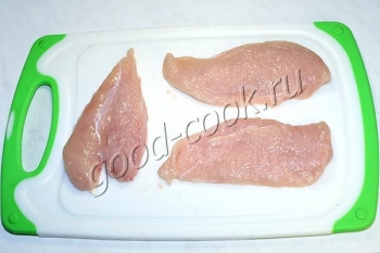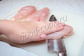 Большое филе положить на доску и крепко прижать сверху ладонью.