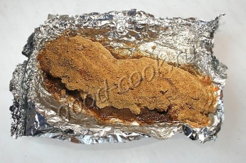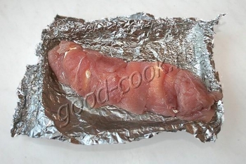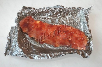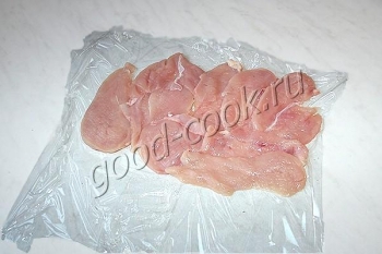 На плёнку уложить отбитые куски в один пласт солёной стороной вниз. Куски