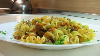 Макароны по-флотски Свиной фарш 300 г.Морковь 1 шт.Лук 1/2Макароны 200 г.Масло для жаркиЗеленьМорковь и лук обжариваем в масле, отдельно обжариваем фарш, солим, перчим и перемешиваем с макаронами. Перекладываем в термостойкую посуду и ставим в духовку на 25 мин при температуре 180*С.