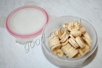Бананы нарезать маленькими кубиками или тонкими кружочками и заморозить.