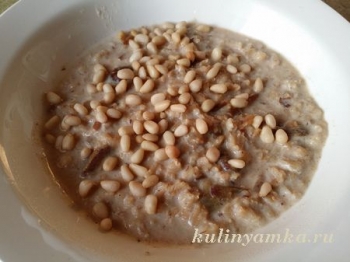 При желании в конце приготовления положить кусочек сливочного масла. кедровые орешки положить в тарелку с кашей. Их можно заменить на любые другие орехи или семечки.