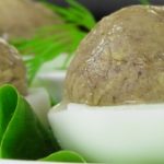Яйца фаршированные куриной печенкой Рецепт приготовления вкусной холодной закуски. Лук и печенку мелко нарезать и обжарить в горячем масле. Накрыть крышкой и припустить...