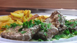 Приготовленно по рецепту из «Книга о вкусной и здоровой пище «: ПЕЧЕНКА В СМЕТАНЕ Печенку (говяжью, баранью или свиную) обмыть, очистить от пленки и желчных протоков, нарезать ломтиками, посолить, посыпать перцем, обвалять в муке и обжарить на сковороде с маслом. Затем сложить в неглубокую кастрюлю, прибавить лук, мелко нарезанный и предварительно слегка поджаренный, сметану, сок со сковороды, на которой жарилась печенка, и один стакан мясного бульона или воды. Закрыть кастрюлю крышкой и тушить на слабом огне 25-40 минут. Ломтики готовой печенки уложить на блюдо. Соус, полученный при тушении, посолить, полить им печенку, посыпав сверху мелко нарезанной зеленью петрушки. На гарнир можно дать жареный или отварной картофель или макароны. На 500 г печенки — 1/2 стакана сметаны, 1 ст. ложку муки, 1 головку лука и 2 ст. ложки масла.