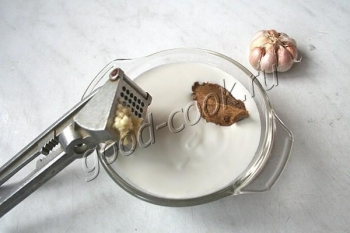 В небольшой мисочке смешать сметану, горчицу, соль, муку и пропущенный через