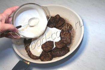 Когда все оладьи пожарятся, вернуть их все в сковороду и залить