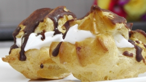 Пирожное из заварного теста с сахарным кремом в шоколадной глазури без лактозы   Тесто:Смешать в кастрюле масло и воду, добавить соль. Поставить на огонь и довести до кипения. Добавить всю муку и непрерывно помешивая варить 2 минуты. Готовому тесту дать постоять 5 минут и замешивая тесто постепенно добавлять по одному яйцу. Используя кондитерский мешок отсадить тесто на противень. Выпекать в разогретой духовке при температуре 220*С — около 10 минут пока изделия не станут золотистыми, затем убавить температуру до 170*С и выпекать до готовности 12-15 минут. Мука 75 г. Растительное масло 50 мл. Яйцо 2 шт. Вода 100 мл. Соль 1/4 ч.л.   Крем: Желатин заливаем холодной водой и даем набухнуть, затем растворяем на водяной бене до прозрачности. В сотейнике растворяем сахар в воде и на медленном огне варим сироп 7-10 минут. Затем соеденить желатин и сироп и взбивать миксером до бела, добавить лимонную кислоту, ванильный сахар и соду и продолжать взбивать 10-12 минут. Сахар 200 г. Вода 125 мл. Желатин 7 г. Лимонная кислота 3 г. Ванильный сахар 1 ч.л. Сода 1 г.   Глазурь:Растворить сахар в воде и варить сироп на среднем огне 8-10 минут. Затем в горячий сироп добавить какао и мешать до загустения. Использовать глазурь пока горячая. Какао 10 г. Сахар 100 г. Вода 40 мл.   25 шт. Время приготовления 50 минут.