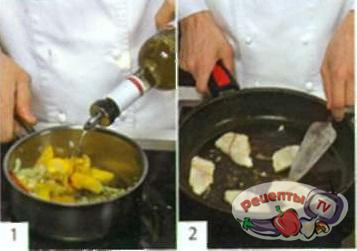 1. Приготовить соус. Персики вымыть, обдать кипятком, затем окунуть в ледяную воду. Снять кожицу и нарезать дольками. Лук очистить и измельчить. Положить в сотейник персики, лук, имбирь и мед. Влить вино. Довести до кипения и варить 10 мин., не накрывая крышкой, до получения мягкой, однородной массы.