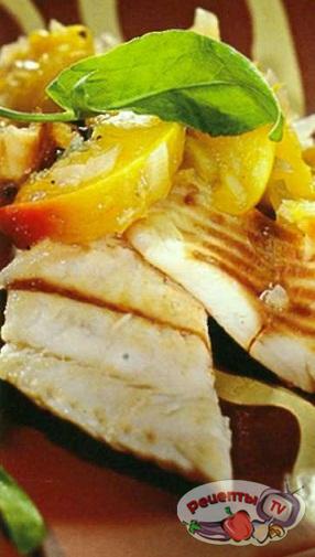 Подать горячей вместе с персиковым соусом. Можно посыпать измельченной кинзой.