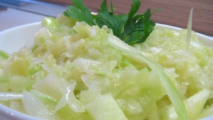 Приготовленно по рецепту из «Книга о вкусной и здоровой пище» Салат из белокочанной капусты с яблоками и сельдереем Очищенные яблоки нарезать ломтиками, сельдерей нарезать соломкой длиной 4-5 см; белокочанную капусту подготовить так же, как указано выше; все это перемешать, сложить в салатник, прибавить сахар и полить уксусом. Этот салат подают ко всем жареным и вареным мясным блюдам, к жареной и отварной рыбе, на гарнир к холодным мясным и рыбным блюдам, а также как самостоятельное блюдо. На 500 г капусты белокочанной — 1 стебель сельдерея (салатного или корневого), 1 яблоко, 1/4 стакана уксуса, 1/2 ст. ложки сахара.