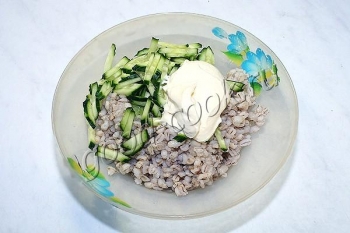 Положить в миску перловку, две трети части нарезанного огурца и майонез.