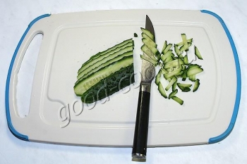 Огурец нарезать тонкой соломкой или небольшими кубиками.