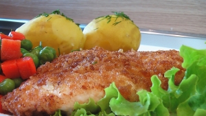 Приготовлено по рецепту из «Книга о вкусной и здоровой пище» ШНИЦЕЛЬ ИЗ КУР В СДОБНЫХ СУХАРЯХ С куриного филе срезать пленку, удалить сухожилия, разбить тяпкой, полить сливками и слегка порубить тупой стороной ножа. Хорошо пропитанное сливками филе обвалять в крупно истолченных сдобных сухарях и обжарить в масле. Шницель подать к столу с овощным гарниром или макаронами, полив растопленным сливочным маслом. Куриного филе — 100 г, сливок — 25 г, масла сливочного — 15 г, масла топленого — 20 г, сухарей сдобных — 25 г. В видео рецепте: Куриное филе 4 шт. Сливки 70 г. Сухари 100 г. Масло для жарки