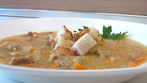 Рецепт из «Книга о вкусной и здоровой пище » 1952 г.изд. Суп гороховый Сварить мясной бульон. Замоченный заранее горох положить в бульон и варить около 1 1/2 часа. Промытые и очищенные коренья и лук нарезать мелкими кубиками, слегка поджарить на масле и за 15-20 минут до подачи на стол положить в суп, добавив соль. Гороховый суп можно варить с ветчиной или копченой свиной грудинкой. Гороховый суп подают с гренками, приготовленными из белого хлеба, нарезанного кубиками. На 500 г мяса-250 г гороха, 200 г кореньев и лука, 2 ст. ложки масла.