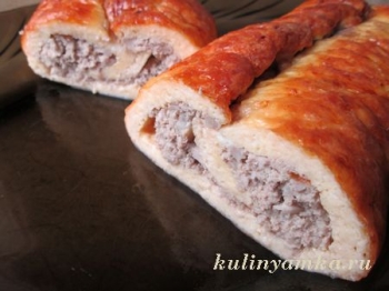 Теперь противень надо достать и поверх сыра, отступив от краев сантиметра 2, ровным слоем разложить мясной фарш. При помощи коврика скатайте рулет и снова уберите его в духовку на 40 минут.
