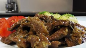 Говядина в луковой глазури с эстрагоном Говядину нарезать брусочками и поместить на сковороду, лук нашинковать и перемешать с говядиной. Добавить соевый соус, масло, сахар, черный...