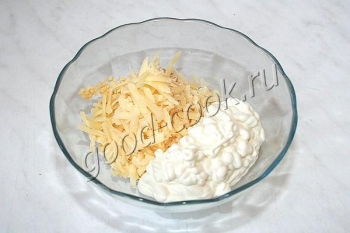 Сыр натереть на крупной тёрке и смешать со сметаной.