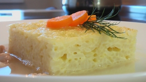 Приготовлено по рецепту из «Книга о вкусной и здоровой пище»: БУЛЬОН С ЗАПЕЧЕННЫМ РИСОМ Рис сварить, откинуть на сито или дуршлаг, дать стечь воде, затем переложить его в миску или тарелку, добавить сырые яйца, масло, часть натертого сыра, соль; все это хорошо размешать и выложить на смазанную маслом и посыпанную толчеными сухарями сковороду. Поверхность риса выровнять ножом, посыпать остальной частью тертого сыра, полить маслом и поставить в духовой шкаф на 15-20 минут для запекания. Запеченный рис слегка охладить, выложить на доску (опрокинув сковороду), нарезать, разложить в тарелки и залить горячим мясным или куриным бульоном. На 2-2,5 л прозрачного бульона — 1/2 стакана риса, 2 яйца, по 1 ст. ложке масла и толченых сухарей, 50 г сыра.В видео рецепте использован куриный бульон, запекалось 25 минут при 190*С. Подавалось с отварной курицей.